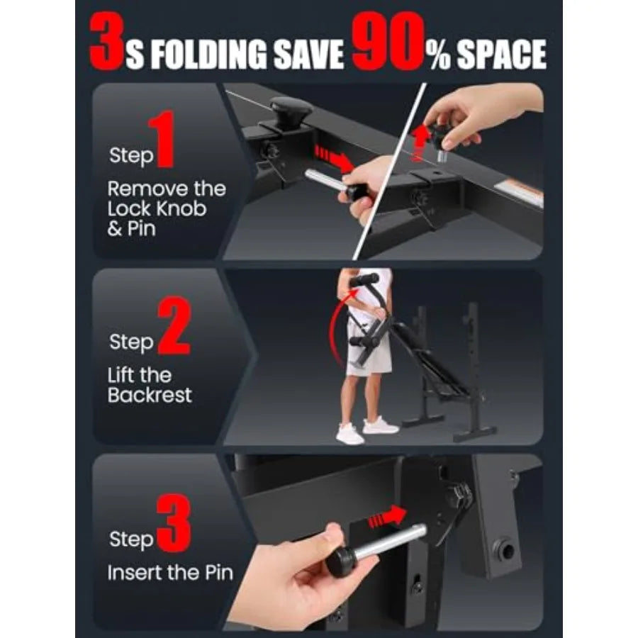 - All-in-one design combines an adjustable weight bench, integrated squat rack, and leg extension for efficient, space-saving workouts, so you can switch from pressing to squatting without moving devices.