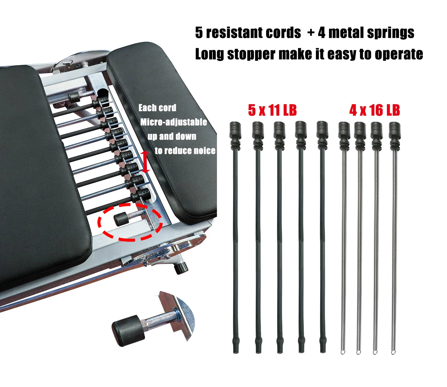 - Five resistance cords with adjustable tension let you tailor workouts from gentle core activation to challenging leg presses, while you enjoy a steady carriage glide.